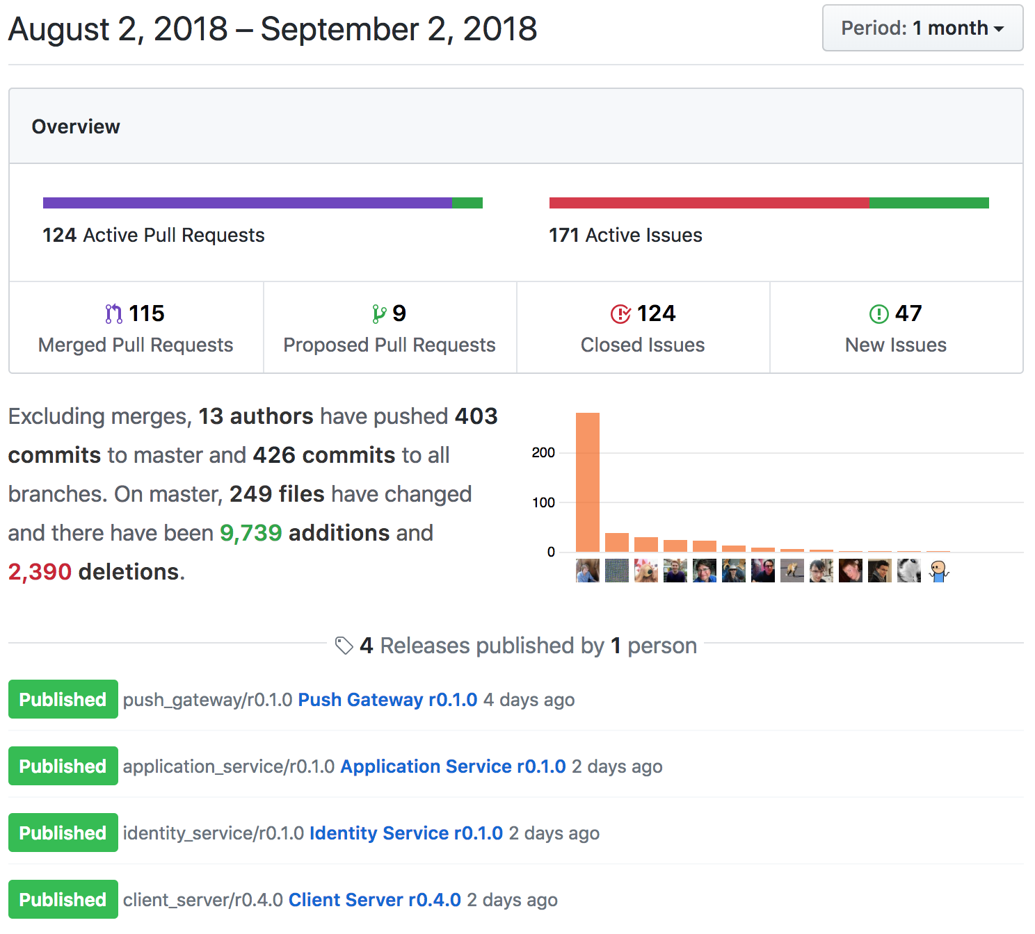 ...or the overall Github Project activity for August. (It's impressive to see Zil0 sneaking in there on second place on the commit count, thanks to all his GSoC work documenting E2E encryption in the spec as part of implementing it in matrix-python-sdk!)